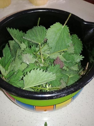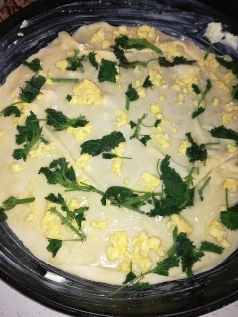 Се редат корите, па се филуваат со сирење и јајца и млада коприва која претходно сте ја обариле и процедиле. Секоја кора се напрскува со масло и путер/маргарин или растопена свинска маст. Одозгора се премачкува со две јајца.
