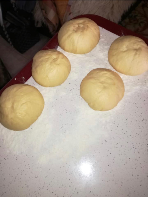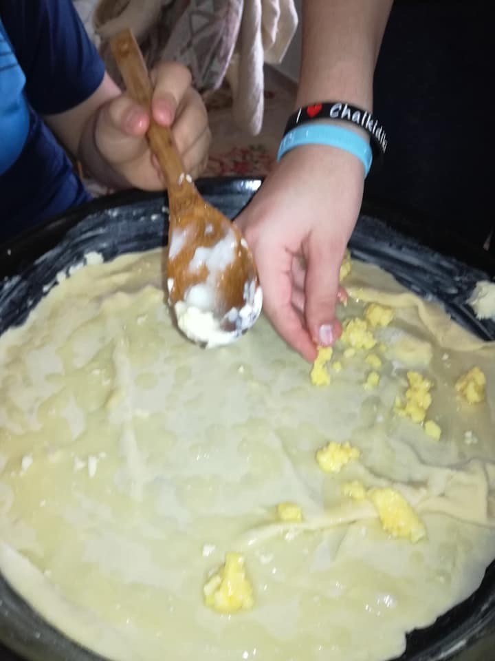 * Исто така, можете да направите 10 топчиња откако еднаш ќе скисне тестото, па секое топче да се расука во помала кора. пет кори се премачкуваат со смеса од масло, свинска маст и путер, претходно растопени.