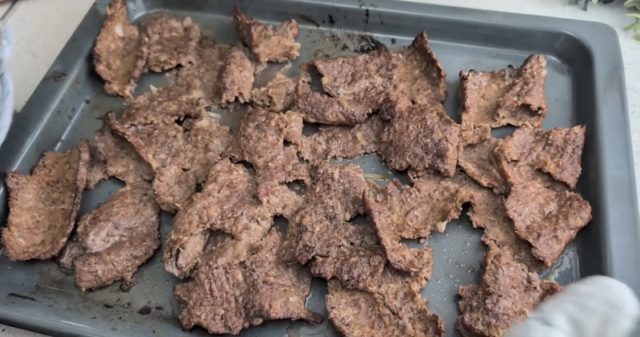 5. На хартија за печење распоредете еден дел од месото во тенок, рамномерен слој. Покријте со уште еден лист хартија и развлечете со оклагија.