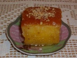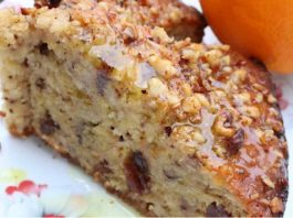 Сочен колач со прелив од портокал, гриз, ореви и суво грозје:...