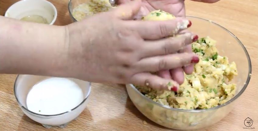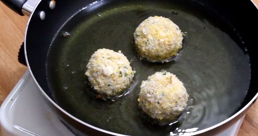 Сите состојки фино измешајте ги за да се изедначи смесата. Кога малку ќе излади, од смесата црпете со лажица и обликувајте топчиња со величина од зрно грозје до орев (по ваш избор) Дланките може малку да ги намастите. Загрејте го маслото и во него спуштајте ги топчињата.