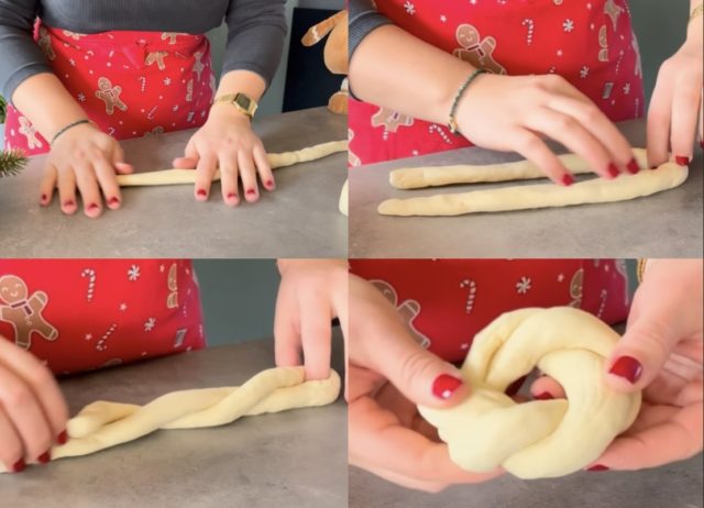 6. Секоја топка развлечете ја во долг валјак, свиткајте ја на половина и сплетете ја спирално, па соединете ги краевите за да добиете форма на ѓеврек.