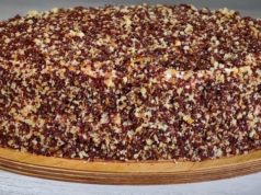 Плехот со дијаметар од 25 см обложете го со хартија за печење и истурете половина од смесата. Ставете да се пече во загреана рерна на 190°C 25-30 минути. Постапката повторете ја со другата половина од смесата.