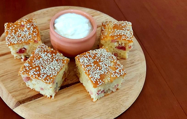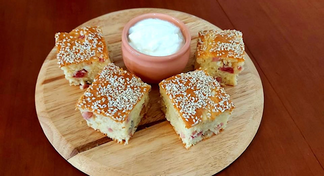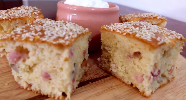 Вака приготвената смеса излејте ја во помала тепсија, претходно малку намастена, одозгора наросете сусам и ставете да се пече во загреана рерна на 180 степени околу 40 минути. Деталите од постапката може да ги погледнете во видеото: