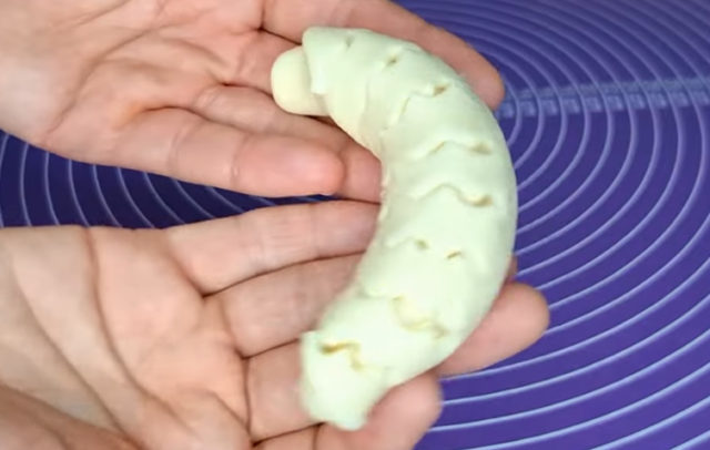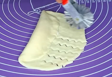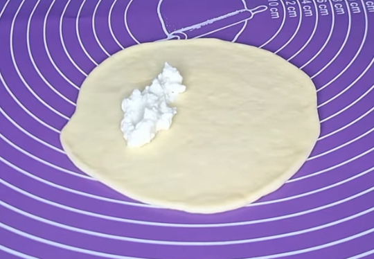 Секое топче раширете го во круг, ставете една лажичка урда преклопете и залепете го со прстите, остатокот исечете го на лентички и свиткајте кифла.