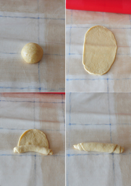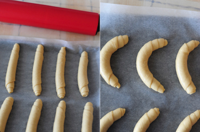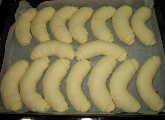 Земете едно топче и со оклагија развлечете го по должина, а потоа свиткајте во кифла. Обликуваните кифли редете ги во плех обложен со хартија за печење (спојката да лежи на дното). Оставете ги наредените кифли да одмораат додека се загрева рерната на 200 степени.