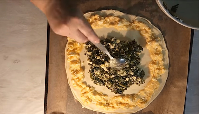 Стасаното тесто поделете го на два дела, а секој дел развлечете го со оклагија во тркалезна кора (за да добиете идеален круг послужете се со тепсија како модла). Кората префрлете ја во плех обложен со хартија. По краевите нанесете го првиот фил од сирење и јајце. Во средината ставете го вториот фил од спанаќ.