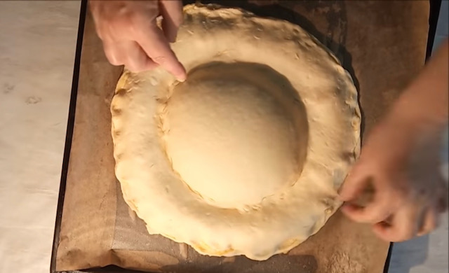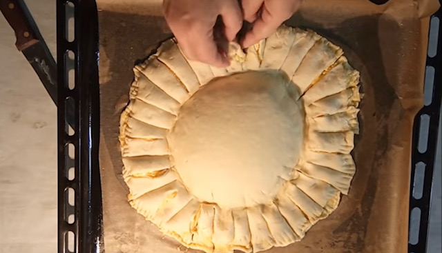 Одозгора поклопете со втората кора, па со прстите притиснете за да се одделат филовите и да се добие форма на цвет. Потоа надворешниот прстен (оној со сирење) исечете го на ленти со широчина од приближно 2 см и вртете ги пресечената страна нагоре.