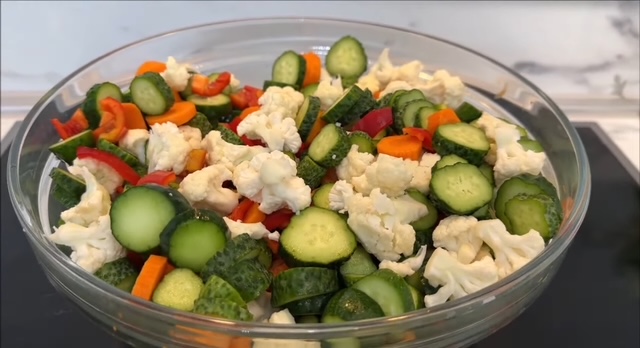 1. Црвените пиперки исечкајте ги на коцки. Карфиолот разделете го на ситни цветчиња. Краставиците и морковите исечкајте ги на тенки тркалца. Потоа, сите зеленчуци добро измешајте ги во голем сад.
