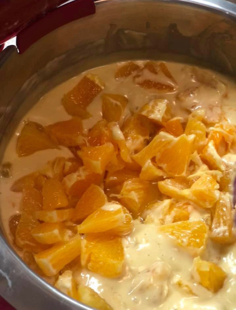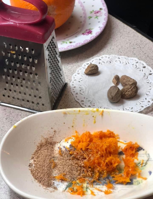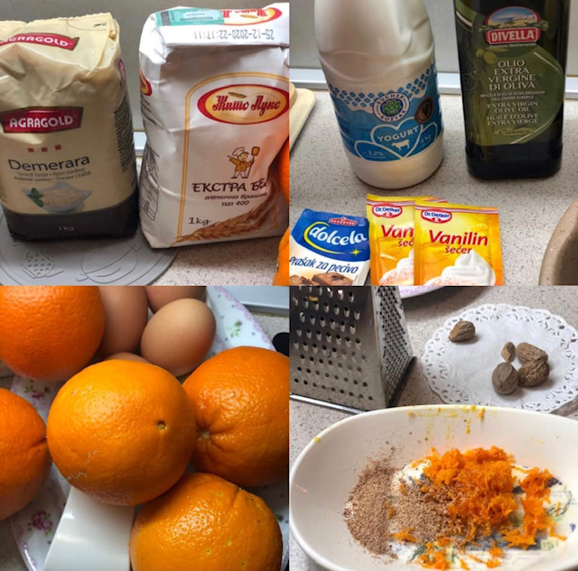На крај се додаваат сечканите портокали и се зачинува по вкус со мускатно оревче и мелен анасон. Се промешува и добиената смеса се излева во претходно намастен и набрашнет калап за куглоф.