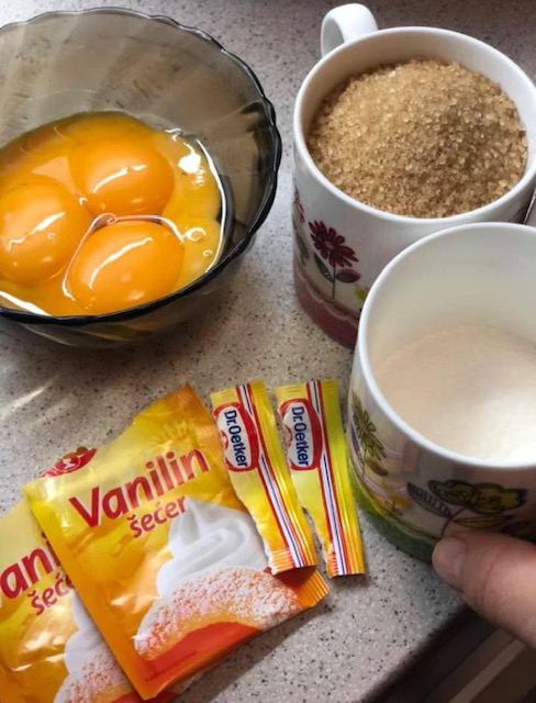Јајцата се матат пенасто заедно со шеќерот додека тој да се растопи и да добиете густа смеса. Постепено, една по една се додаваат останатите состојки и убаво се промешува за да се изедначи смесата.