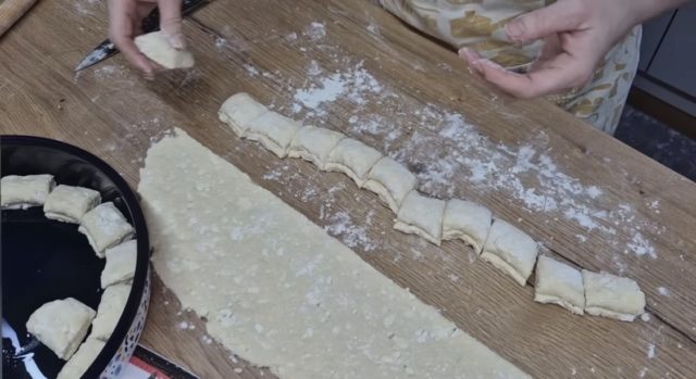 Ролатите исечете ги на еднакви парчиња и наредете ги во намастена тркалезна тепсија со пречник од 36 см.